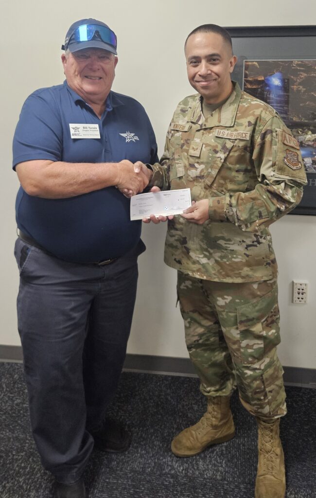 On February 10, 2026, Bill Yucuis, the Waterman-Twining Chapter President, went to MacDill AFB to present the Fall CCAF Semester Pitsenbarger Award to SrA Jimmy Montero. Jimmy has recently completed his Bachelor Degree in Business Management and is now working on his Masters Degree.